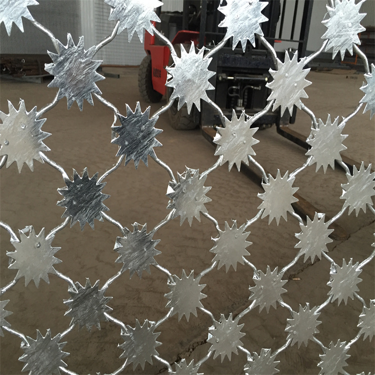 監獄梅花刺隔離網網片整體熱鍍鋅,上鋅量不低于300克,可做霧化試驗,鋅層要求使用不低于10年。