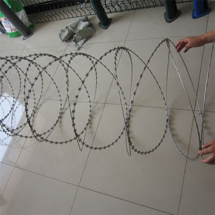 V字形單臂焊接固定鉤子,用來固定拉絲。然后把看守所刀刺網駕于V型支架上面,用專門]的卡扣固定。是圍墻頂部用隔離網由V型支架立柱,加強型焊接片網,安全防盜連接件和熱鍍鋅刀片刺籠組成強度和安全防御性級別很高。近年來被廣泛應用在監獄,軍事基地等高安全場所。既起到圍欄作用,又起到美化作用。由于具有安全性高、防攀爬能力好,網片連接方式采用特制SBS緊扣件,有效防止人為的破壞性拆卸,橫向四道折彎加強筋,使網面強度顯著增加。