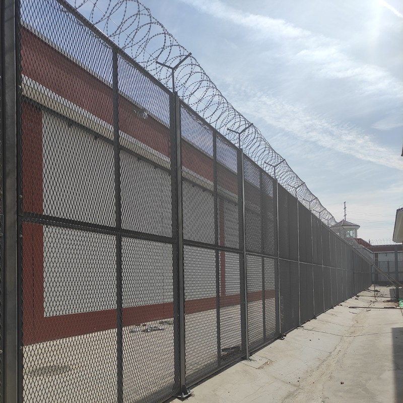 監(jiān)獄圍欄網構造:首先把網片焊接在鐵管框架上,框架是方管或者圓管焊接成的框架構造,在框架上焊接用于個立柱銜接的銜接板,用防盜螺栓與立柱銜接。為了保證網片的防拆卸性能,網片銜接方式采用特制防盜緊扣件,有效避免人為的毀壞性拆卸。