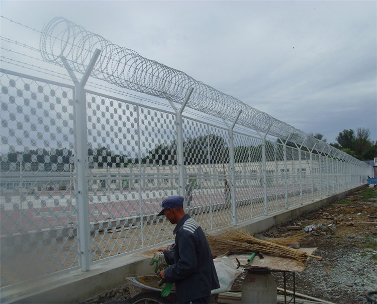2)在監(jiān)獄鐵絲護欄網的頂部安裝刀片大大提高了監(jiān)獄鐵絲護欄網的阻嚇效果,而總成本并未增加太多。同時,監(jiān)獄鐵絲護欄網還是國內外受歡迎的隔離網。