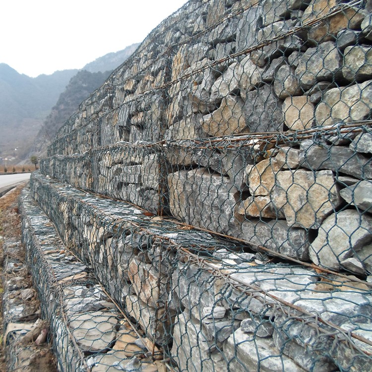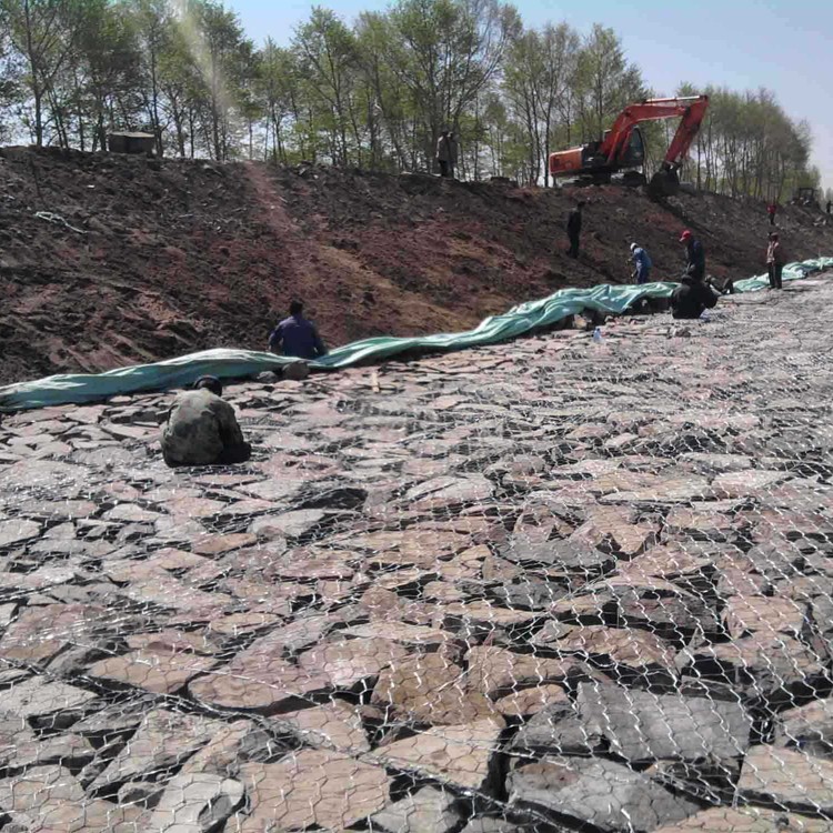 4、河道石籠網是將抗腐蝕耐磨高強的低碳高鍍鋅鋼絲或5%-10%鋁鋅合金鍍層鋼絲,由機械將雙線絞合編織成多絞狀,六邊形網目的網片,其雙線絞合部分的長度應不小于5cm,以不破壞鋼絲的防護鍍層。