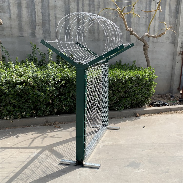 鋁包鋼勾花護欄網是新型的機場隔離網,它是由Y型燕尾立柱、鋁包鋼勾花網、鋁包鋼刺絲網組成,鋁包鋼機場圍界具有獨具匠心的鋼絞線穿插式連接立柱和網片,在保證美觀大方的同時,能夠承受20kN推力的鋁包鋼絞線使整體圍界足夠堅固耐用。鋁包鋼線的制作方法是在鋼絲上包覆一層鋁,包覆方法為Conclad擠壓法,也有采用粉末冶金技術將鋁粉末包到鋼絲上,包鋁后可冷拔以提高強度。這是一種較難制造的金屬線,尤其是控制好鋼絲表面質量、拉絲潤滑及防止造成后續應用斷絲等方面。