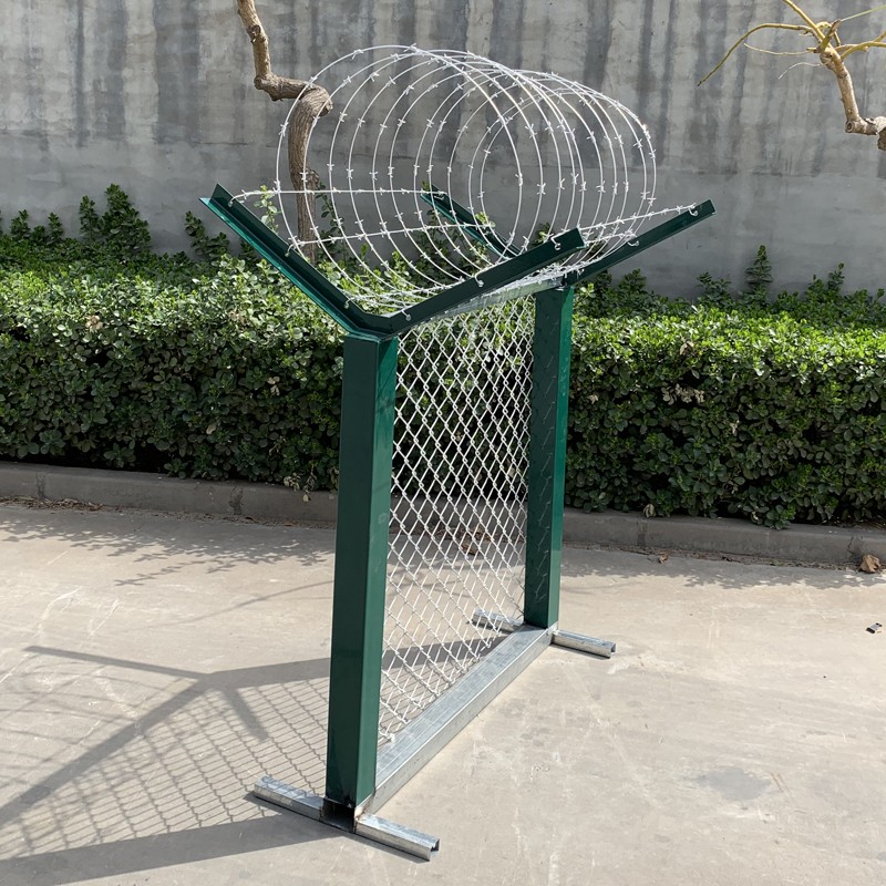 4、鋁包鋼絲菱形網采用冷拉低碳鋼絲外經包覆鋁層的防腐處理,鋁包鋼絲抗拉強度應達到500MPa,立柱采用由冷軋鋼帶直縫焊接而成的矩形燕尾鋼管并作內外防腐處理,要求鋼帶抗拉強度應達到375MPa;斜撐采用由熱軋鋼帶直縫焊接而成的矩形鋼管并作內外防腐處理,要求鋼帶抗拉強度應達到375MPa.延伸臂由熱軋角鋼焊接而成并作防腐處理,要求抗拉強度應達到375MPa.鋁包鋼絲滾籠為主絲直徑3. Qm的冷拉高碳鋼絲,抗拉強度應達到1340HPa; 刺絲為直徑2. 2m的冷拉低碳鋼絲,抗拉強度應達到500MPa,鋁包鋼刺絲為主絲直徑2.8mm的冷拉高碳鋼絲,抗拉強度應達到13401Pa;刺絲為直徑2.2mm的冷拉低碳鋼絲,抗拉強度應達到500MPa, 間距均為100~120m。 鋁包鋼絲滾籠與刺鋼絲采用不銹鋼扎絲連接,沿長度方向每500mm設4個連接處。
