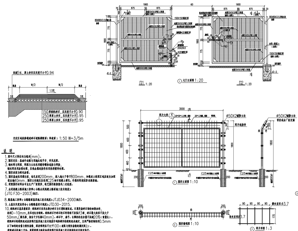 3、基礎部分根據各地區地質地貌的結構和復雜程度的差異,施工的過程中要針對不同地質狀況實施專業技術,基礎部分根據實際情況,一般地質如粉土,沙土等,地基承載力<300KPa,采用300×300×1000 mm的基礎,以達到其基礎的穩定;特殊地質如山區段,地基承載力≥300KPa,采用300×300×500 mm的基礎。說明中隔離柵樣式及參數僅為推薦,不作為指定樣式,施工選取隔離柵時,隔離柵立柱、橫梁、孔徑等不得低于本圖提供參數,且需滿足《隔離柵》(GB/T 26941-2011)規范中相關參數要求。