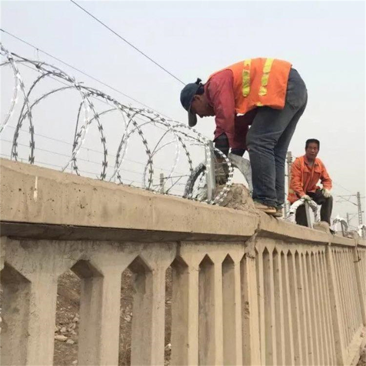 (3)304不銹鋼蛇腹型刀刺網用4根直徑3mm的不銹鋼鋼絲繩固定在Y型立柱部位,拉絲和刀刺用均直徑1mm的不銹鋼絲或專用卡扣捆扎,牢固,不晃動。