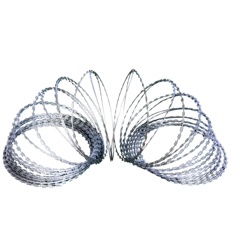鐵路刺絲滾籠VS蛇腹形刀片刺繩 高鐵刀片刺絲滾籠 直徑50厘米刀片刺繩,刀片刺繩又名刮刀型刺絲,是圍墻防護(hù)、隔離防護(hù)網(wǎng)產(chǎn)品。鋒利的刀型刺由雙線扣裝后成蛇腹?fàn)睿鸬搅俗鑷樧饔谩M瑫r該產(chǎn)品美觀、防阻效果好、施工便利等優(yōu)點。刀片刺繩用于邊境做防護(hù)用,因刀片鋒利不易觸摸,起到一定的嚇阻作用那個,刀片刺繩,用途,他可以用于居民的墻體防護(hù),圈地工廠圍墻小區(qū)墻垛等。型號:刀片刺網(wǎng)分為BTO-22。