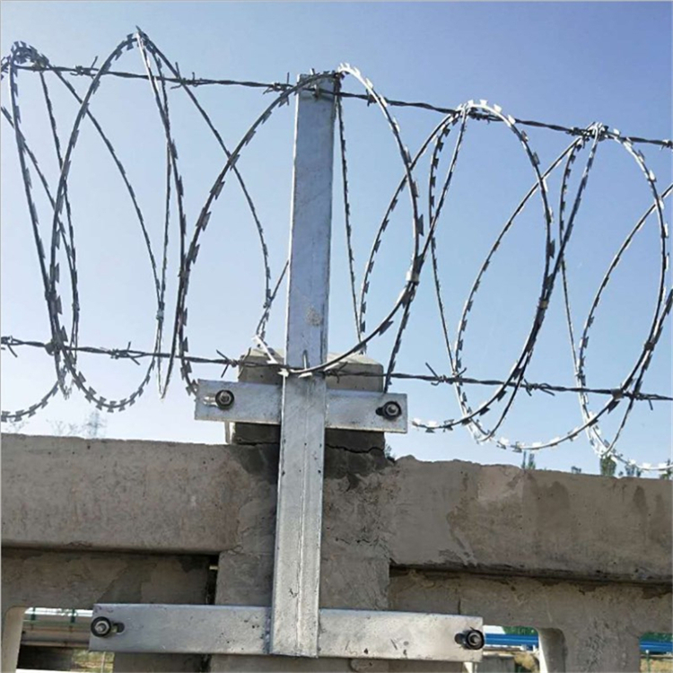 采用刀片刺繩繞圈后相臨兩圈每隔120°用刺絲連接卡固定,張開后形成蛇腹網狀,閉合后刀片刺繩圈徑為50cm,張開后每交叉圈安裝間距20cm,直徑不小于45cm。 由刺絲連接卡扣與固定在支架上的縱向拉筋相連接,縱向拉筋與支架的連接采用?2.5mm的冷拔鍍鋅鋼絲繞2圈后擰緊固定,支架設置在跨度3m防護柵欄的立柱和跨中位置,其他跨度僅設置與立柱上部,支架與防護柵欄采用支架抱箍連接。