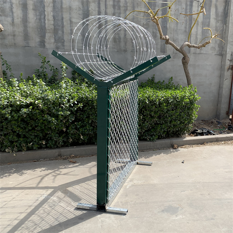 機場鋁包鋼護欄網無論是樣式還是顏色做出來都非常的漂亮。雖然在價格上鋁包鋼圍界不占據優勢,但是在防腐性能上,鋁包鋼機場圍界有很大的優勢。大家如果有經常坐飛機的朋友可以看到機場外圍有一層綠色金屬絲編織或焊接的圍網,這就是我們經常說的機場圍界網,而我要給大家介紹的是一種我們公司近兩年研制的新型機場圍界產品—鋁包鋼絲/鋁包鋼線機場圍界網。鋁包鋼絲機場圍界網是使用一種新型原材料鋁包鋼絲制作而成的機場圍界網產品,鋁包鋼絲是將鋼絲芯線外層包裹一層鋁作為外層防腐材料,它比傳統的PE或者PVC包塑鋼絲防腐性能更強,通常可以延長機場圍界產品使用壽命10-15年以上,適合于沿??諝鉂駶櫢g性強的地區和環境較惡劣的沙漠邊緣地帶。鋁包鋼絲機場圍界網孔一般為50*50mm,絲徑5mm,頂部可搭配有V字叉和刀刺滾籠以加強防護能力。它還有一個優點就是鋁層是與鋼絲一起經機械拉拔到一起的,不易脫落。