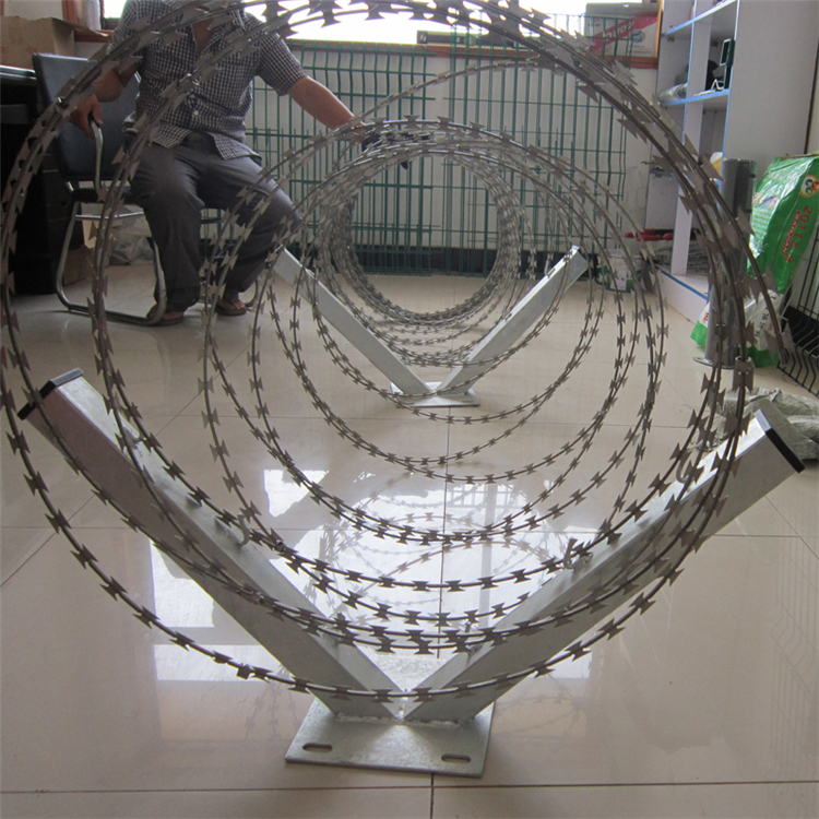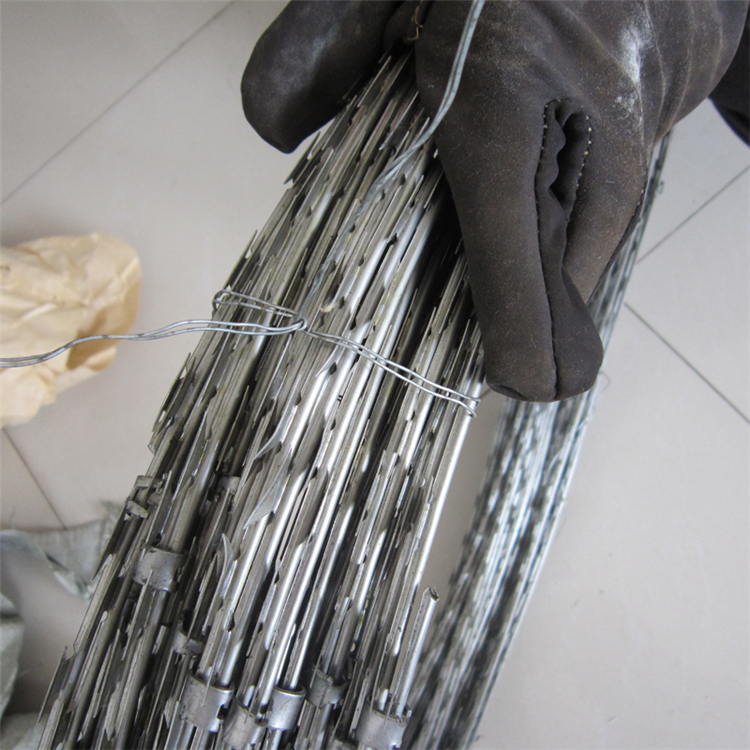 刀片刺網(wǎng)又名蛇腹型刀刺網(wǎng),是一種近年發(fā)展起來的防護(hù)、隔離能力較強(qiáng)的安全防護(hù)網(wǎng)產(chǎn)品。制作工藝:它采用鋼板沖壓成型包附于鋼絲之上,由銳利尖角鍍鋅鋼板或不銹鋼薄板做刀片,高張力鋼絲做芯線組合而成的。鋒利的刀型刺由雙線扣裝后成蛇腹?fàn)睿让烙^又讓人不寒而栗,起到了很好的阻嚇作用。
