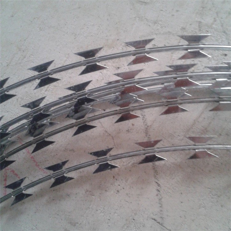 刀片刺網就是采用鋼板(刀板)沖壓成型包附于熱鍍鋅鋼絲(芯線)之上,由銳利尖角鍍鋅鋼板或不銹鋼薄板做刀片,高張力鋼絲做芯線組合而成的。從它的外形可以分為:螺旋式刀片刺網、交叉式刀片刺網、平板式刀片刺網和直線式刀片剌網。那么刀片刺網到底有什么作用呢?我們可以從它的特點來看。刀片刺網的另一個名字叫刮刀型刺絲,因為它是由鋒利的刮刀刺通過雙線扣裝成蛇腹狀而成的,所以看起來既美觀又具有防護的作用,使人不敢觸碰,并且安裝起來也十分便利。