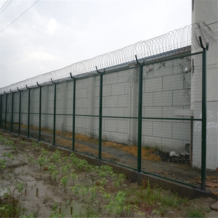 核電站圍欄網主要由高強度刀片刺網和普通防護網結合而成,由V型支架立,加強型焊接片網,安全防盜連接件和刀片刺網組成。刀片刺網是一種新型防護網,由銳利尖角鍍鋅鋼板或不銹鋼薄板做刀片,鋼絲做芯線組合而成。核電站圍欄網的規格如下: