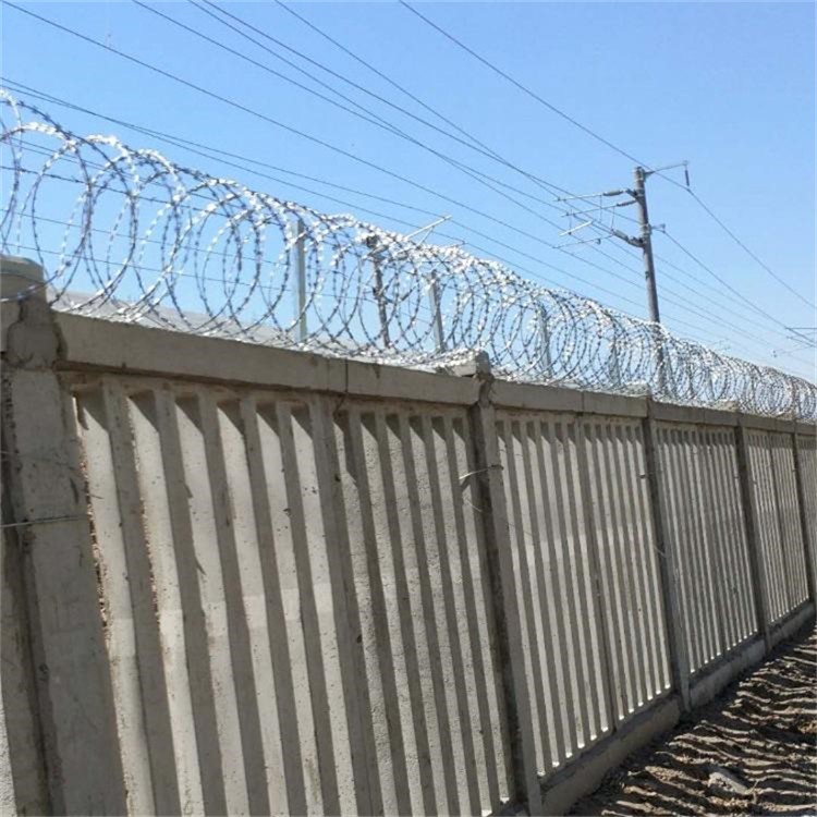 刺絲滾籠也叫刀刺滾籠,由刺絲連接卡扣與固定在支架上的縱向拉筋相連接,縱向拉筋與支架的連接采用直徑2.5mm的冷拔鍍鋅鋼絲繞2圈后擰緊固定。支架設置在跨度3m防護柵欄的立柱和跨中位置,刺絲滾籠跨度僅設置于立柱上部,支架與防護柵欄采用支架抱箍連接。