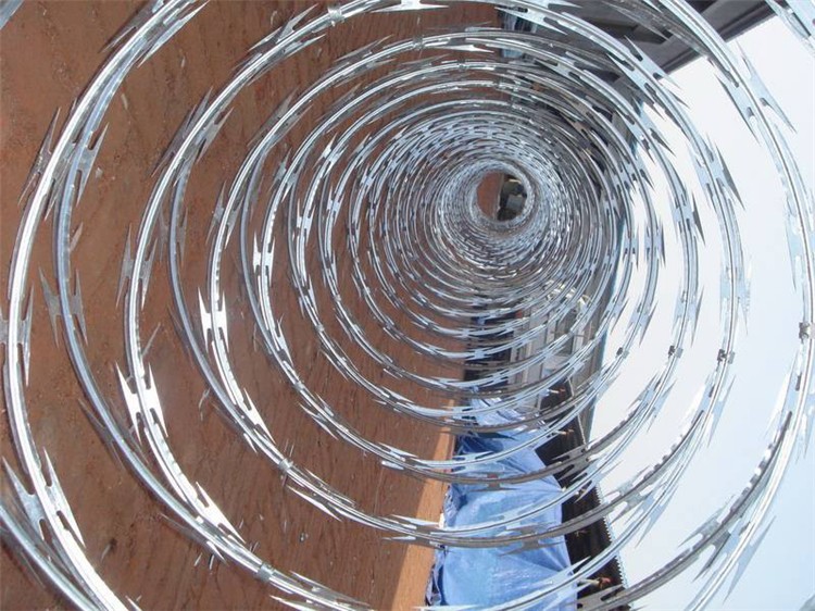 圍墻倒刺鋼絲網的直徑一般是50公分和60公分。我廠備有大量現貨,當天可發貨。刀片刺繩為熱鍍鋅鋼板經過沖壓而成的刀片形狀的防護網,圈經為50厘米,螺旋覆蓋長度為10米-12米。