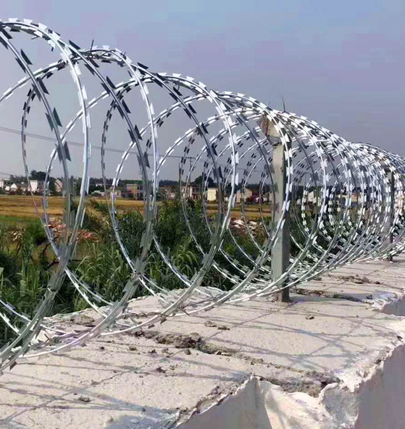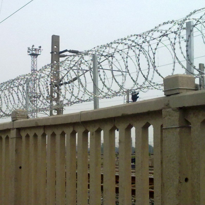 鐵路安裝刺絲滾籠時,安裝隊伍應穿著專用工作服,利于警告車輛在此施工,施工人員配帶手套以防劃傷,利用刀片刺繩立柱結合應用于高速公路兩側,安裝方法快捷。