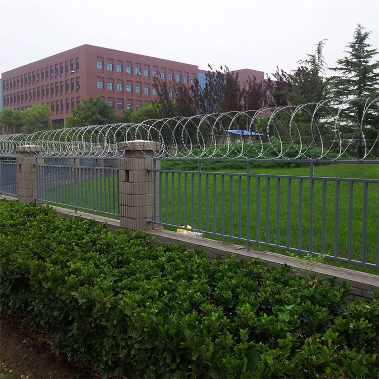 從使用環(huán)境來說,有一些學(xué)校因為建設(shè)的時間很長了,圍墻相對于現(xiàn)在的新式圍墻就低矮一些。我們就選擇既可以防爬又能增加圍墻高度的刀刺網(wǎng)。也就是我們常見的蛇形刀片刺繩。這種刀刺網(wǎng)的直徑有50公分、60公分,安裝以后圍墻高度會增加,既有防攀爬的效果又能增加圍墻的高度。