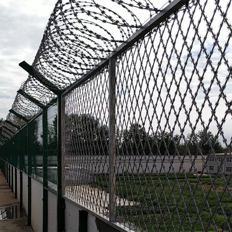 監獄隔離網是非常重要的監獄安全防護設施,由焊接鋼網加蛇腹形刺網組合而成。監獄鋼網墻具有結構新穎、堅固緊密、網面平整、網孔均勻、鋒銳利、防攀爬、抗腐蝕性強等特點。建設于監獄的內外墻地面及高墻之上,網墻內側或頂部加裝蛇腹形刺網,形成一道高不可攀、難以逾越的隔離障礙。配合高壓打擊電網、各種監控報警設備確保監獄安全萬無一失。